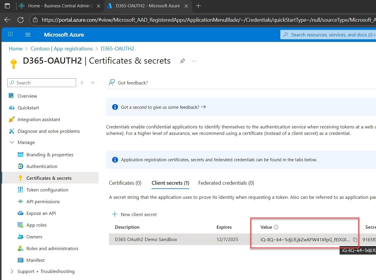 You’ll see a record created under the Client secrets tab. Copy and securely store the value shown in the Value field.