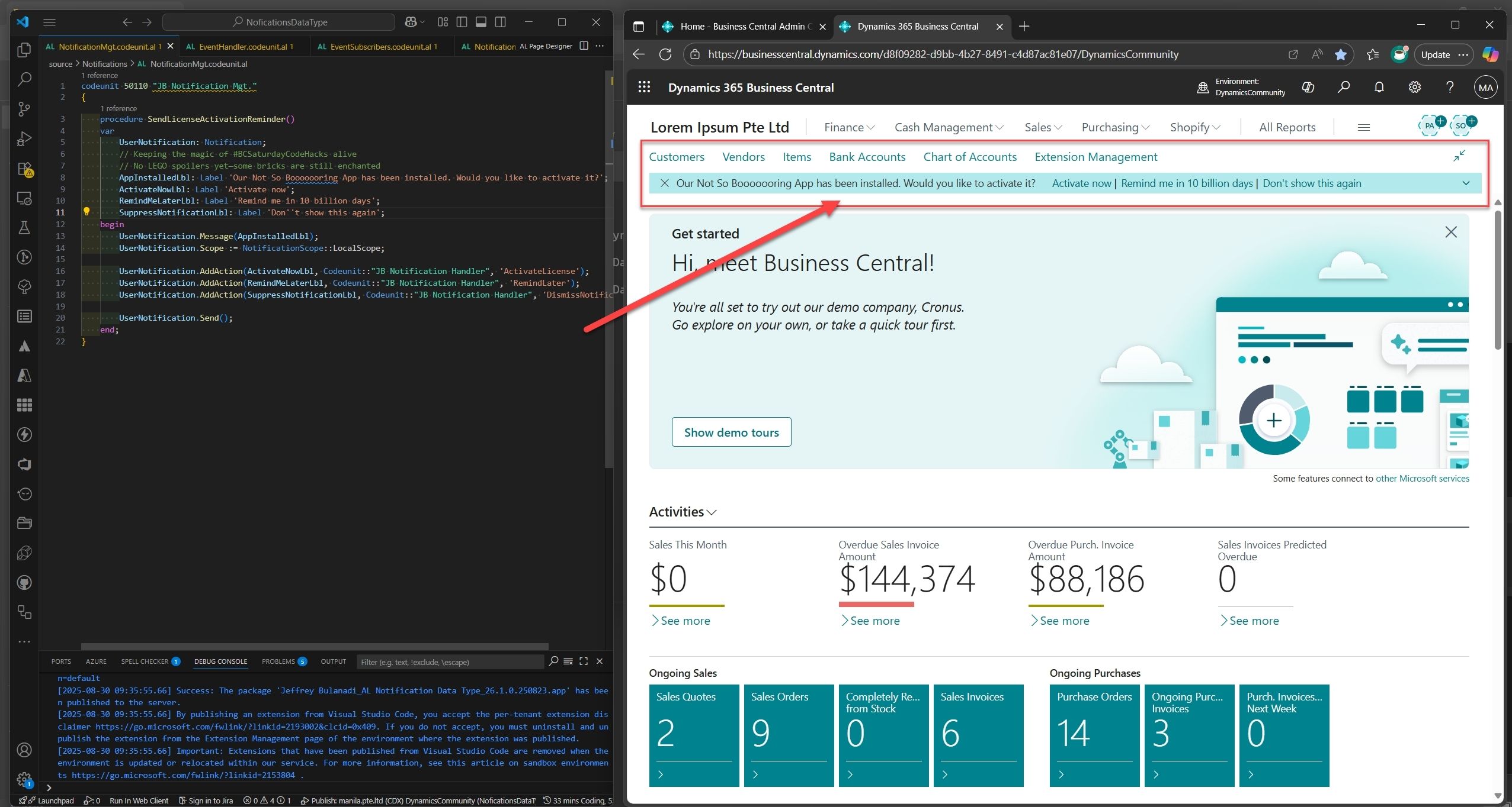 This demo mirrors the behaviour of a well-known document capture AppSource app. Upon installation, it leverages Codeunit 1430 – Role Center Notification Mgt., just like the technique we explored in last week’s #BCSaturdayCodeHacks, to deliver a subtle, non-intrusive prompt encouraging users to activate their license.
